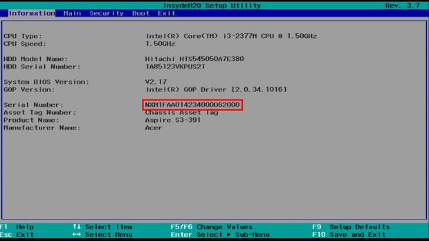 Ngay khi màn khởi động laptop vừa xuất hiện, bạn có thể dùng một trong các phím sau ESC, F2, F8 hoặc F12 tùy từng dòng laptop để truy cập vào bios của máy và tìm số Serial laptop như hình bên dưới.