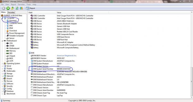 Bạn có thể tải phần mềm Everest bản portable (tải về chạy luôn không cần cài đặt) tại đây. Khi khởi động phần mềm, nó sẽ tự thu thập tất cả thông tin về laptop và bạn có thể xem số Serial laptop như hình bên dưới.