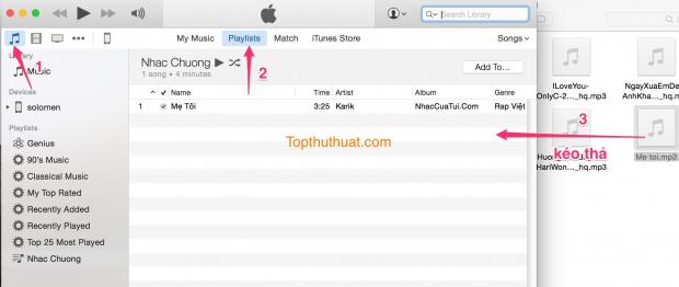 Trước tiên, bạn cần kết nối thiết bị với máy tính Windows hoặc Mac. Sau đó, chọn biểu tượng Nhạc Chọn Playlists Sau đó kéo thả tập tin nhạc Mp3 vào giao diện iTunes mà bạn muốn đặt làm nhạc chuộng cho iPhone hoặc iPad.