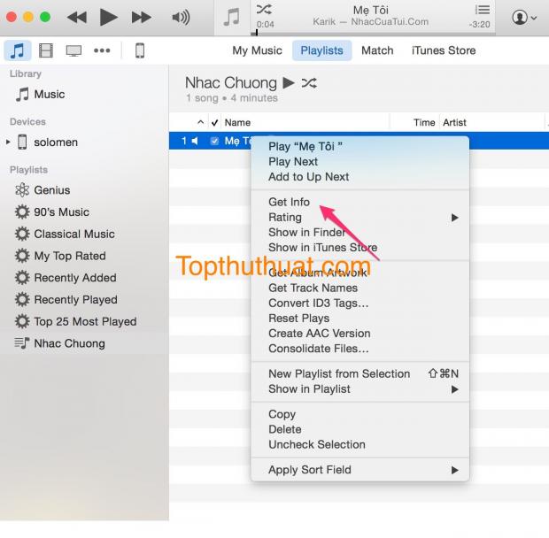 Quan trọng: Bạn cần trở lại iTunes và chọn chuột phải vào file nhạc đã tạo AAC Chọn Delete. 'Nếu không xoá tập tin nhạc này bạn sẽ không thể bỏ tập tin m4r vào iTunes như bước dưới được'.