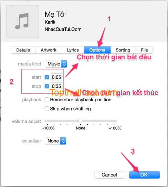 Chọn vào thẻ Options. Chọn thời gian bắt đầu đoạn nhạc vào ô (Start) và thời gian kết thúc vào ô (Stop). Sau đó, chọn OK