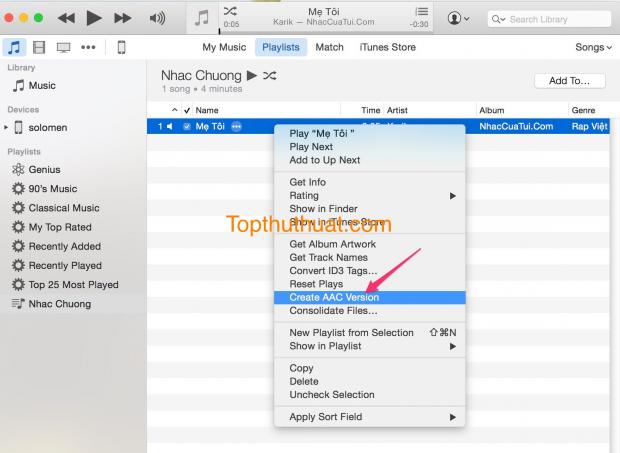 Sau đó, bạn tiếp tục chọn chuột phải vào tập tin nhạc Chọn Create AAC Version.