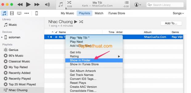 Chờ vài giây, bạn hãy chọn chuột phải vào tập tin nhạc, chọn Show in Finder trên Mac (chọn Show in Windows Explorer trên Windows).