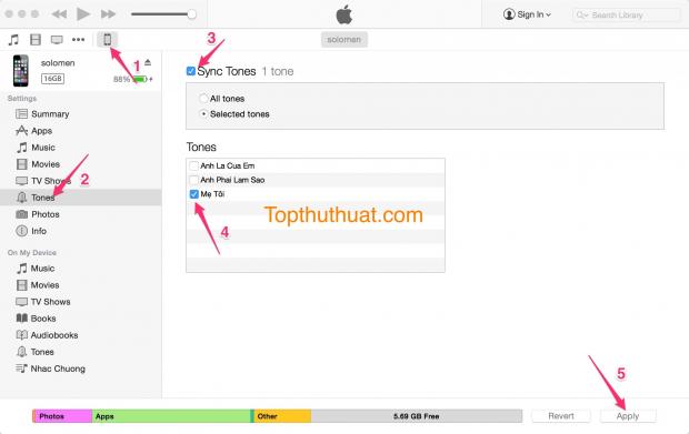 Cuối cùng, trên iTunes. Bạn chọn vào biểu tượng Điện thoại Tones Chọn vào Sync Tones Chọn bài hát đặt làm nhạc chuông Chọn Apply.