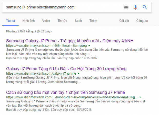 Để chỉ định Google tìm nội dung trong một trang web bất kì bạn chỉ cần thêm cú pháp: site:trang web ngay sau nội dung tìm kiếm. Ví dụ: Samsung J7 Prime site: dienmayxanh.com.
