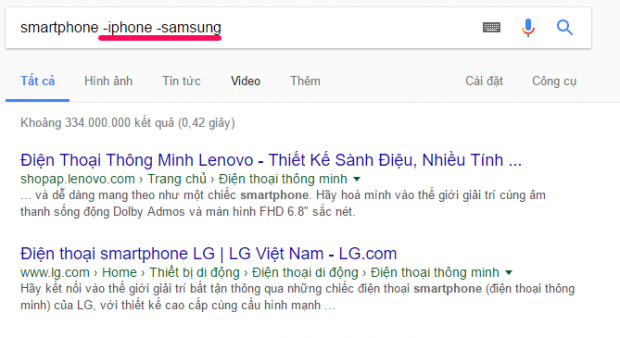 Nếu bạn muốn bỏ qua các kết quả có liên quan đến một nội dung nào đó chỉ cần gõ thêm dấu trừ - trước từ khóa đó.