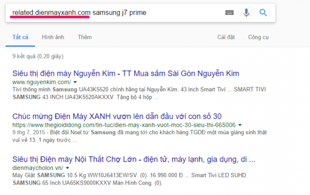 Bạn cũng có thể giới hạn phạn vi tìm kiếm cho nội dung, chỉ tìm trong các trang web tương tự nhau. Cú pháp: từ khóa + related: trang web. Ví dụ ở đây mình muốn tìm samsung j7 prime trên cách trang cùng bán hàng trực tuyến như chúng tôi, gõ như sau: samsung j7 prime related dienmayxanh.com.