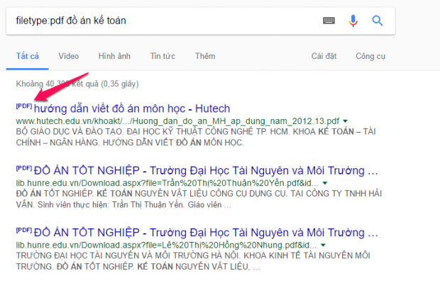 Nhiều trường hợp cần tìm nội dung chính xác định dạng của tài liệu, ví dụ loại văn bản word, excel hay pdf. Lúc này chúng ta gõ theo cú pháp: từ khóa cần tìm + filetype: định dạng.