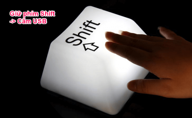 Để khắc phục tình trạng này thực ra có một tuyệt chiêu cực kì đơn giản. Bạn chỉ cần nhấn giữ phím shift trên bàn phím rồi mới cắm usb vào máy. Đến khi nào thấy hiện ổ đĩa usb thì thả phím shift ra.