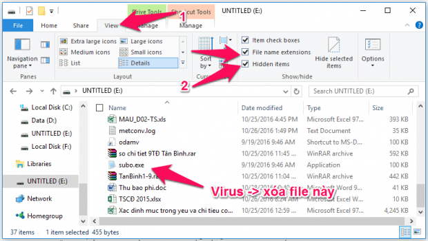 Đầu tiên bạn cần bật tính năng hiện đuôi file (định dạng của dữ liệu) và xem file ẩn như hình bên dưới.