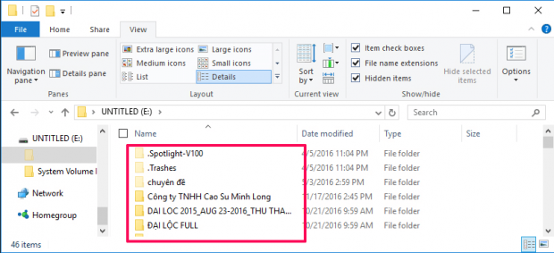 -Bị virus ẩn đi (trường hợp này cực kì thông dụng): hãy mở tính năng xem file ẩn như mục 3. Có thể bạn sẽ thấy một thư mục ẩn như hình bên dưới. Thực ra tất cả dữ liệu của bạn đã bị virus dấu vào thư mục này.
