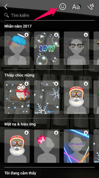 Bước 4: Đầu tiên mình đến với biểu tượng mặt cười ở phần này sẽ có nhiều hiệu ứng hình ảnh cho bạn lựa chọn theo từng chủ đề khác nhau như năm mới, giáng sinh…