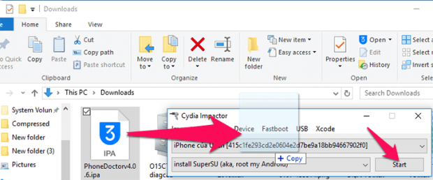 Kết nối iPhone vào máy tính. Kéo file PhoneDoctor.ipa vào phần mềm Impactor để cài đặt.