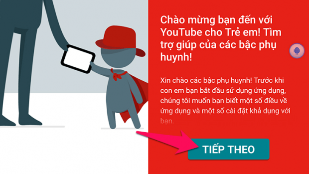 Mở ứng dụng Youtube Kids, nhấn vào Tiếp theo.