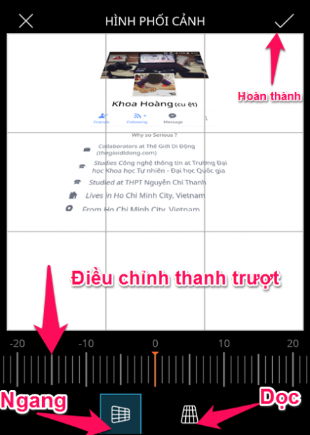 Chọn phối cảnh theo chiều ngang hoặc dọc và điều chỉnh thay chạy bên dưới để tạo hình 3D. Nhấn vào góc phải trên để đồng ý.