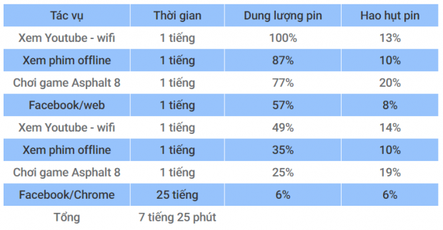 2. Thời lượng pin sử dụng liên tục: 7 giờ 25 phút