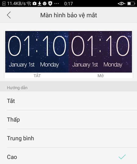 Ở đây bạn chọn chế độ Thấp, Trung bình hoặc Cao. Chế độ càng cao thì ánh sáng xanh càng bị loại bỏ nhiều.