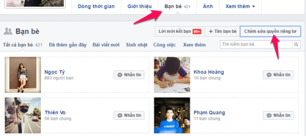 Đầu tiên bạn vào mục Bạn bè, chọn Chỉnh sửa quyền riêng tư.