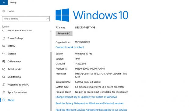 Ở đây bạn có thể thấy những thông số sau: phiên bản Windows 10 và Build, dung lượng RAM có trong máy, thông số Processor, và System type của hệ thống.