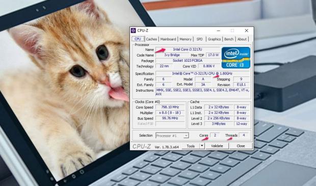 Tab này chủ yếu cho chúng ta biết thông tin về tên CPU Intel core i3-3217U có tốc độ 1.80 GHz. Tiếp đến bên góc dưới cùng bên phải có thông số Cores 2 Threads 4 tức là CPU có 2 nhân 4 luồng xử lý.