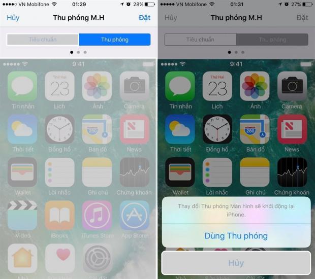 Để tăng kích thước các biểu tượng trên iPhone, bạn chọn dạng Thu phóng và chọn Đặt. Sau đó nhấn chọn Dùng thu phóng để thiết lập.