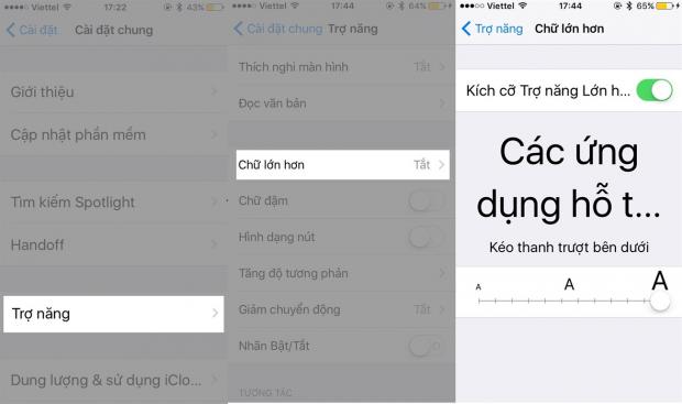 Tăng kích thước chữ được xuất hiện trên hầu hết các thiết bị iOS, bạn chỉ việc vào Cài đặt > Cài đặt chung > Trợ năng và chọn Chữ lớn hơn.