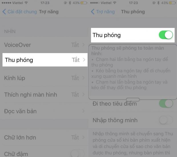 Một trợ năng khá hay ho mà Apple tích hợp lên hệ điều hành iOS của mình. Tính năng Thu phóng này hoàn toàn khác với Thu phóng biểu tượng ở mục 1. Bởi nó sẽ phóng to toàn màn hình của iPhone với chế độ khá đặc biệt và bạn có thể di chuyển kính lúp ảo xung quanh màn hình đến vị trí cần xem rõ hơn.