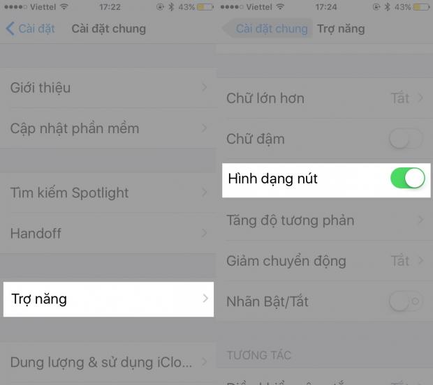 Bạn chỉ cần truy cập vào Cài đặt > Cài đặt chung > Trợ năng. Sau đó kích hoạt tùy chọn Hình dạng nút.