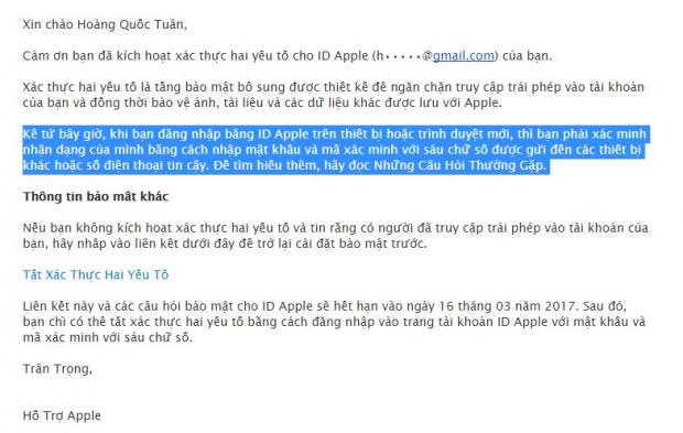 Đồng thời Apple cũng sẽ gửi cho bạn 1 email về việc bật xác thực 2 yếu tố, để tắt tính năng này bạn vui lòng làm theo hướng dẫn trong email nhận được.