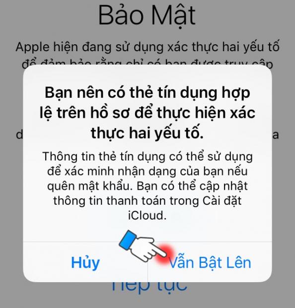 Bước 7: Apple sẽ khuyên bạn nên có thẻ tín dụng để thực hiện, nếu không có thẻ tín dụng bạn chọn Vẫn bật lên.