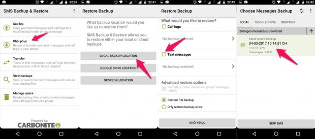 Bước 5: Sao chép tập tin XML lên điện thoại Android thông qua máy tính hoặc một số dịch vụ lưu trữ đám mây khác > Sử dụng SMSBackup & Restore để khôi phục tin nhắn lên thiết bị. Bạn cũng có thể tham khảo thêm một số ứng dụng khôi phục SMS khác trên Play Store nhé