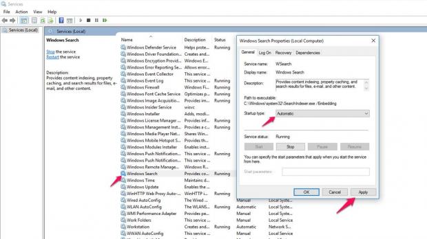 Bước 2: Tìm kiếm Windows Search sau đó chọn Properties, click chọn Automatic (Delayed Start) hoặc Automatic. Click Apply để hoàn tất thay đổi