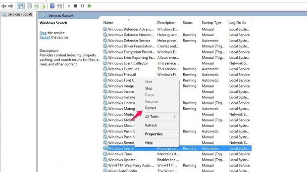 Bước 3: Chuột phải vào Windows Search, chọn Restart