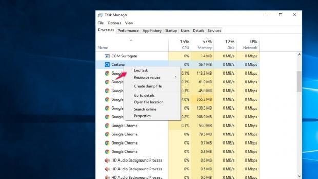 Bước 2: Tìm kiếm tiến trình Cortana đang chạy. Và tắt nó bằng cách chuột phải, click vào End Task