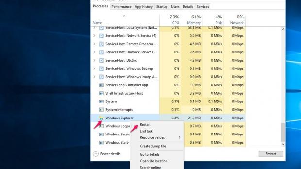 Làm tương tự phương án hai. Nhưng ở Task Manager, tìm đến Windows Explorer, chọn Restart
