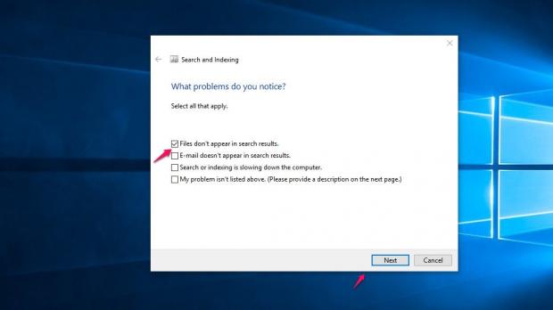 Bước 5: Bạn hãy tích chọn những vấn đề đang gặp phải. Trong trường hợp này chúng ta click Files don't appear in search results. Sau đó nhấn Next để phần mềm tiến hành sửa lỗi
