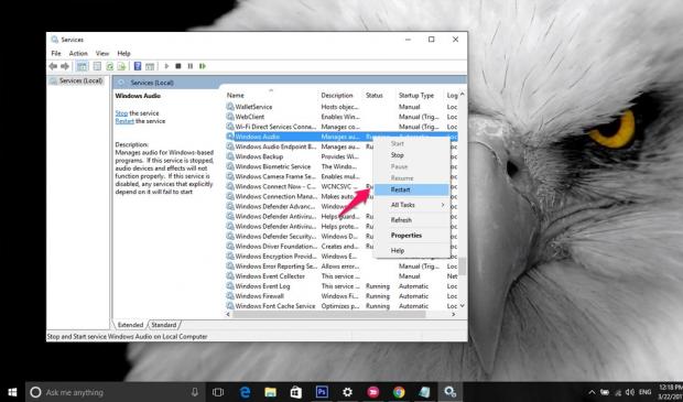 Bước 2: Tìm đến Windows Audio Service, chuột phải chọn Restart