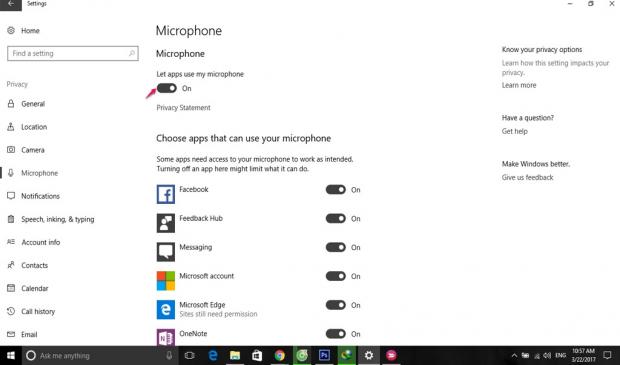Bước 2: Bạn chọn Microphone sau đó click On, ngoài ra bạn có thể chọn ứng dụng mà bạn muốn sử dụng Microphone