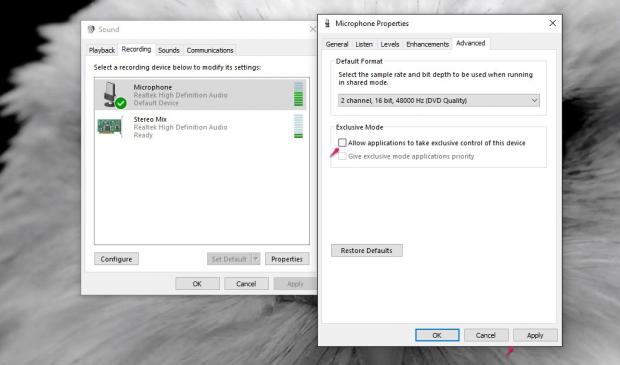 Bước 3: chọn tab Advanced, bỏ chọn Allow applications to take exclusive control of this device, sau đó click Apply
