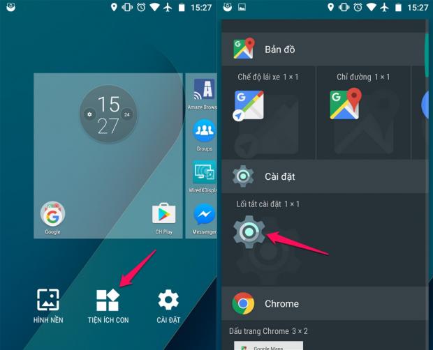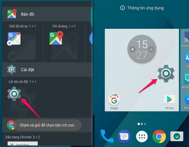 Trong mục Tiện ích con, bạn tìm đến Lối tắt cài đặt sau đó chạm + giữ để đưa shortcut ra màn hình chính và chọn tiện ích sử dụng.