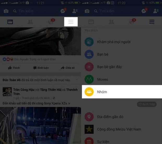 Trên smartphone android bạn cũng có thể làm tương tự bằng cách truy cập vào mục Menu > Nhóm.