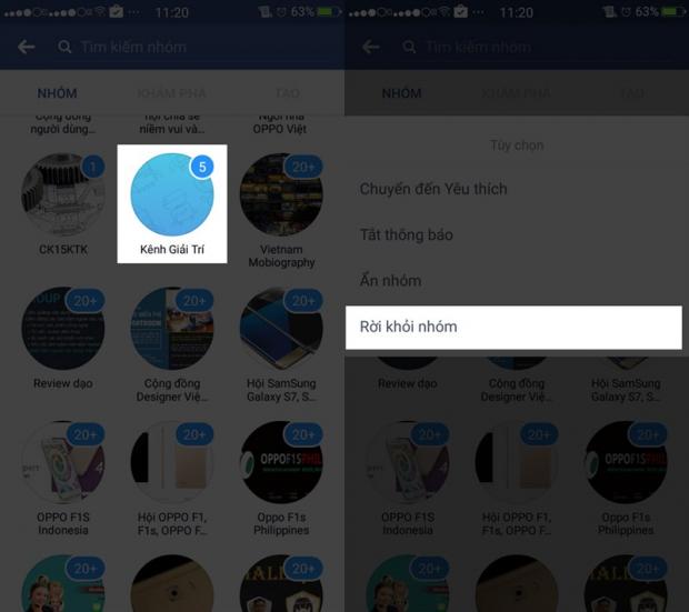 Tại đây sẽ liệt kê những group mà bạn đã tham gia. Muốn thoát khỏi nhóm nào, mọi người chỉ việc nhấn giữ và chọn Rời khỏi nhóm là xong.
