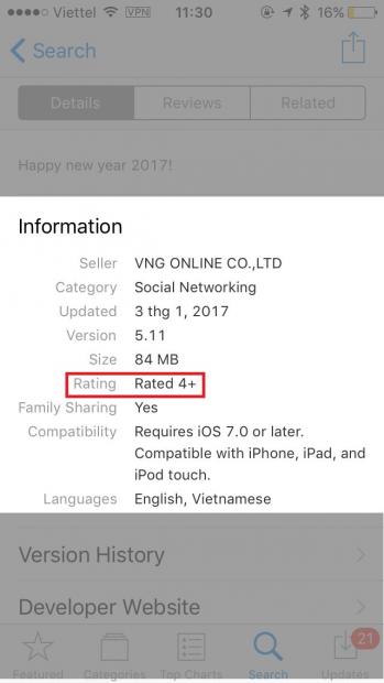Thật khó có cách nào giúp ẩn các ứng dụng trên iPhone, trừ việc sử dụng ứng dụng khác hỗ trợ. Tuy nhiên bây giờ bạn không cần phải tốn thêm dung lượng để tải các app này. Việc bạn cần làm là truy cập vào Appstore để kiểm tra ứng dụng cần ẩn, để ý ở mục Thông tin có Giới hạn tuổi.