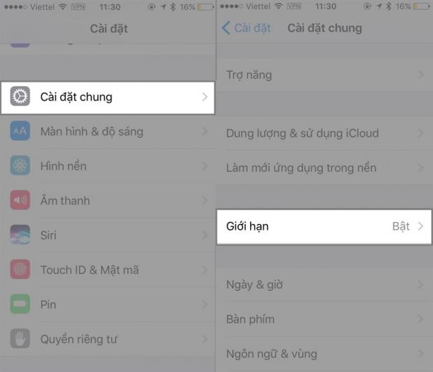 Sau đó vào Cài đặt > Cài đặt chung > Bật Giới hạn lên.