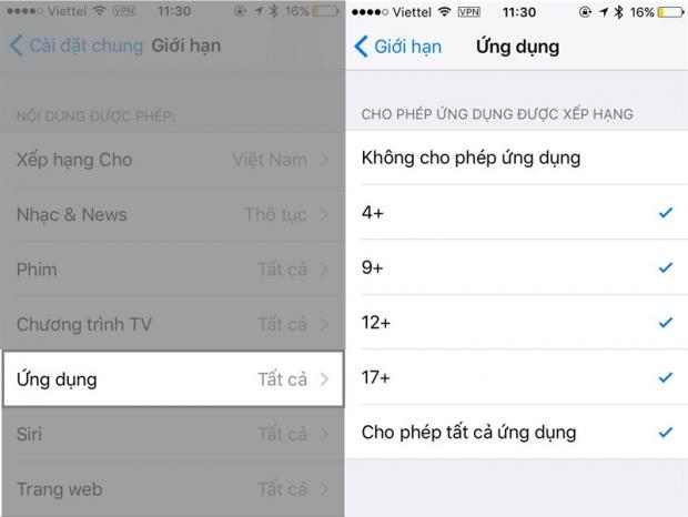 Ở đây hãy truy cập vào tùy chọn Ứng dụng. Tính năng sẽ liệt kê hàng loạt Giới hạn tuổi cho bạn lựa chọn, việc bạn cần làm chỉ là tắt đi dấu Tick xuất hiện trên thang giới hạn.