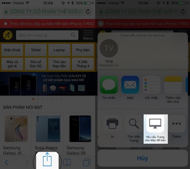 Bạn chỉ việc truy cập trang Web, sau đó chọn biểu tượng chia sẻ, và tìm tùy chọn Yêu cầu Trang cho Máy để bàn.