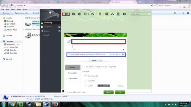 Khi nhấn vào dấu '+', ô donwload sẽ xuất hiện. Chúng ta sẽ tiến hành copy địa chỉ của file cần download vào ô ở trên cùng, tiếp đến chọn nơi sẽ lưu ở ô màu xanh, và nhấn OK để tiến hành download.