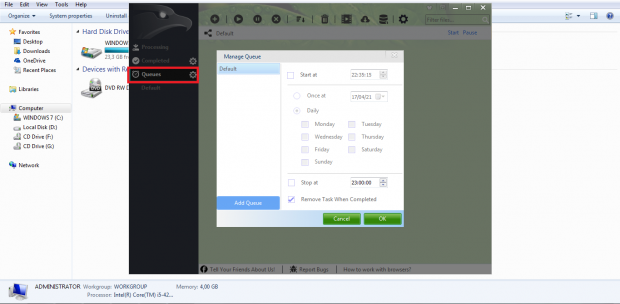 EagleGet còn cho phép điều chỉnh thời gian tắt, bật của phần mềm trong quá trình sử dụng: Queues - Default.