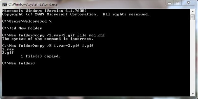 - Bây giờ bạn cần kết hợp 2 file của mình vào làm 1 như sau (giả sử ta đặt tên file 1 là 1.rar - trong trường hợp tập tin bạn muốn up file rar này lên Flickr, file 2 là 2.gif):C:\New folder>copy /B 1.zip+2.gif 1.gif.