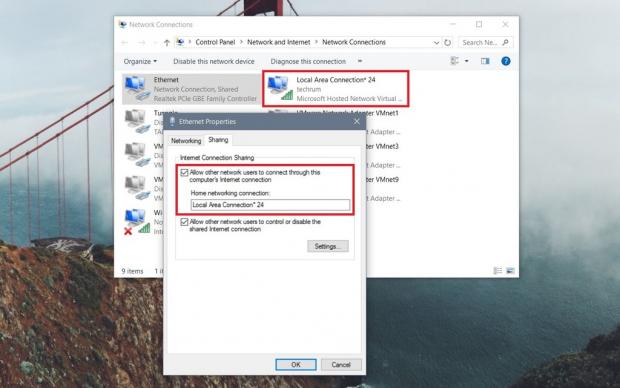 Bước 5: Chọn tab Sharing, đấu dấu tick vào ô Allow other network users to connnect through this computer's Internet connection, sau đó chọn tên trạm phát Wi-Fi vừa khởi tạo (trong hình thì card mạng đó của mình có tên là Local Arena Connection* 24). Rồi bấm OK.